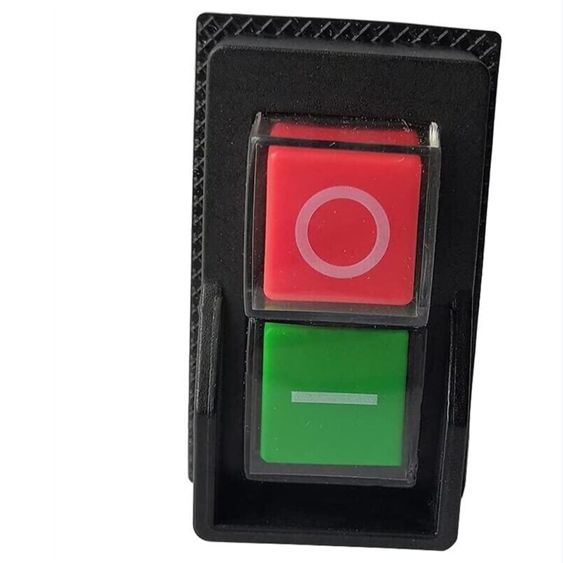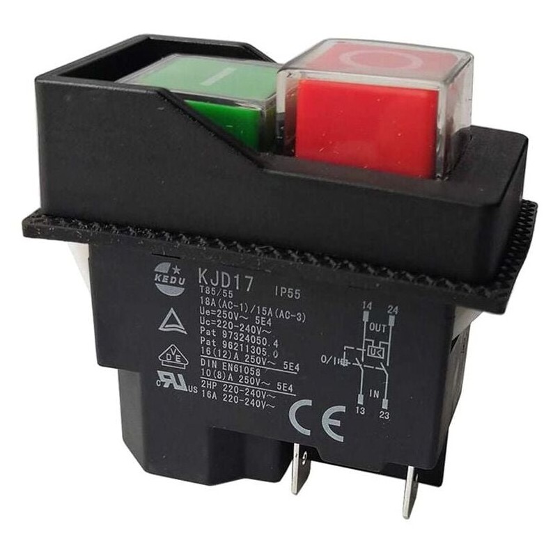 KEDU MOTORSTARTER RØD/GRØN 2POLET 230V Med spændingsfaldsudløser. AC-1 Ue:230V 18,0A Ohmsk belastning AC-3 Ue:230V 15A Elmotor IP54 tætning Hul/indbygningsmål ca. 46,5 x 22,2 mm 4 stk Spadestik 6,3mm for kabelsko for el tilslutning.