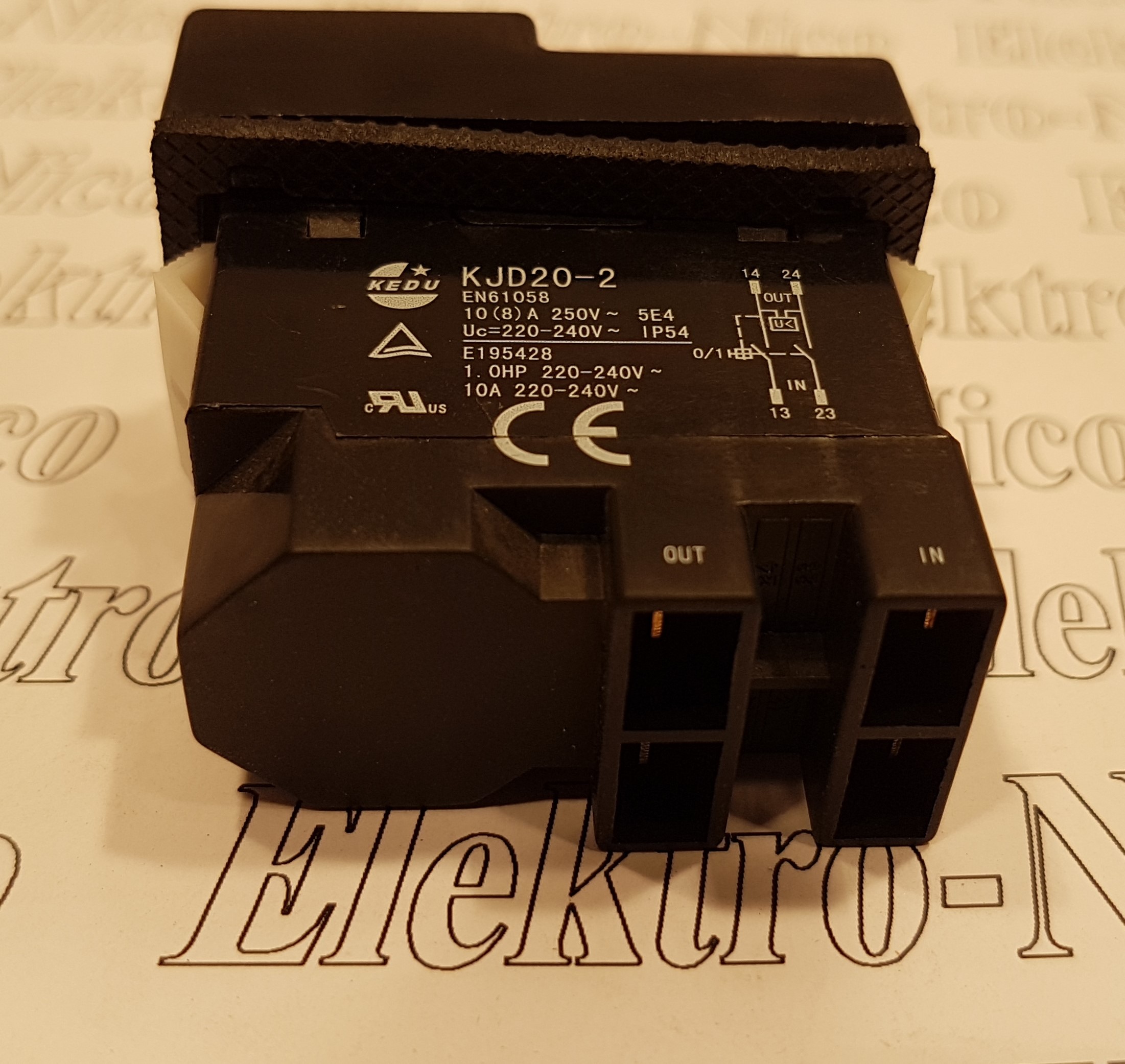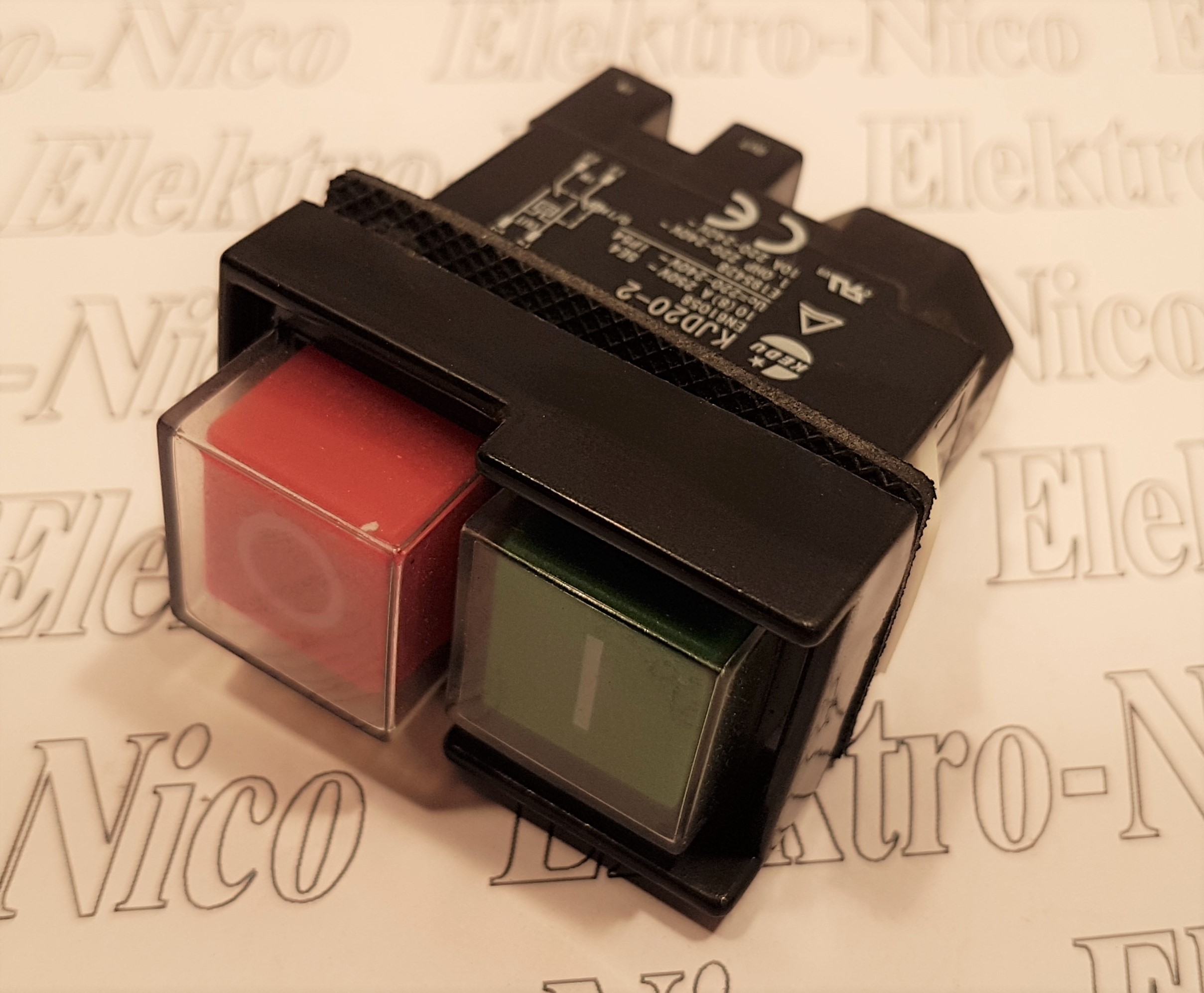 KEDU MOTORSTARTER RØD/GRØN 2POLET 230V Med spændingsfaldsudløser. AC-1 Ue:230V 10,0A Ohmsk belastning AC-3 Ue:230V 10A Elmotor 0,75KW/1HK IP55 tætning Hul/indbygningsmål ca. 46,5 x 22,2 mm Spadestik 4,8mm for kabelsko.